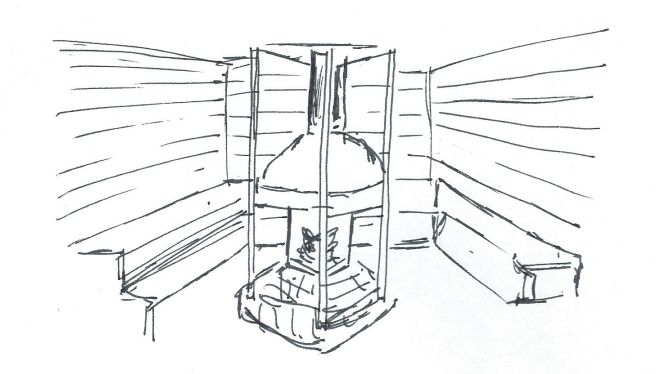 Notre partie préférée des thermes se situe en-dehors de la soucoupe, au jardin très joliment arboré. Il y a des petites terrasses, des chemins qui serpentent vers des espaces saunas. Des transats invitent à s’y reposer, mais le printemps était encore un peu trop timide le jour de notre visite. Nous nous sommes plutôt réchauffés dans le sauna au feu de bois. Le repos est total avec l’odeur du feu et le bruit du crépitement.
